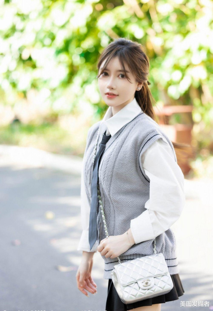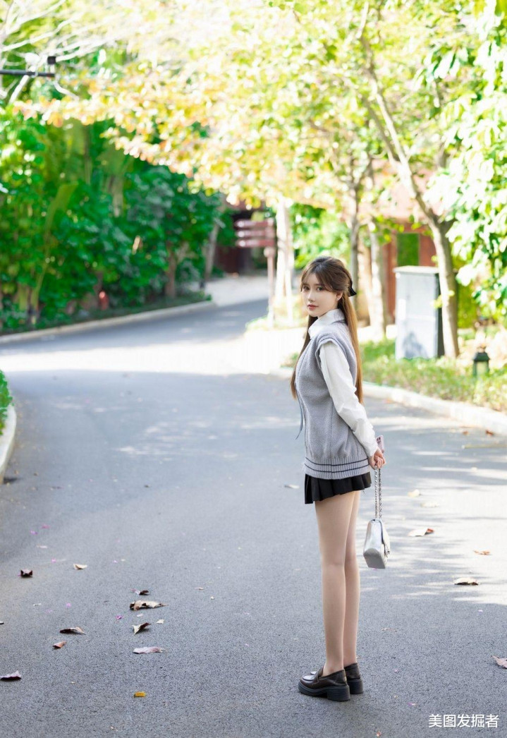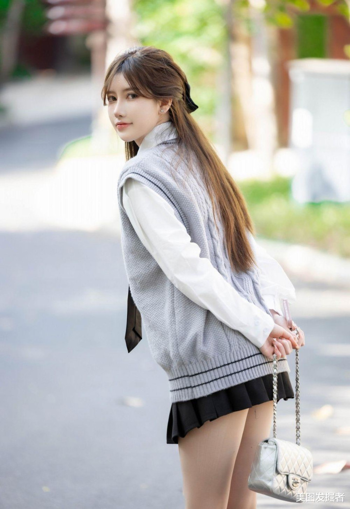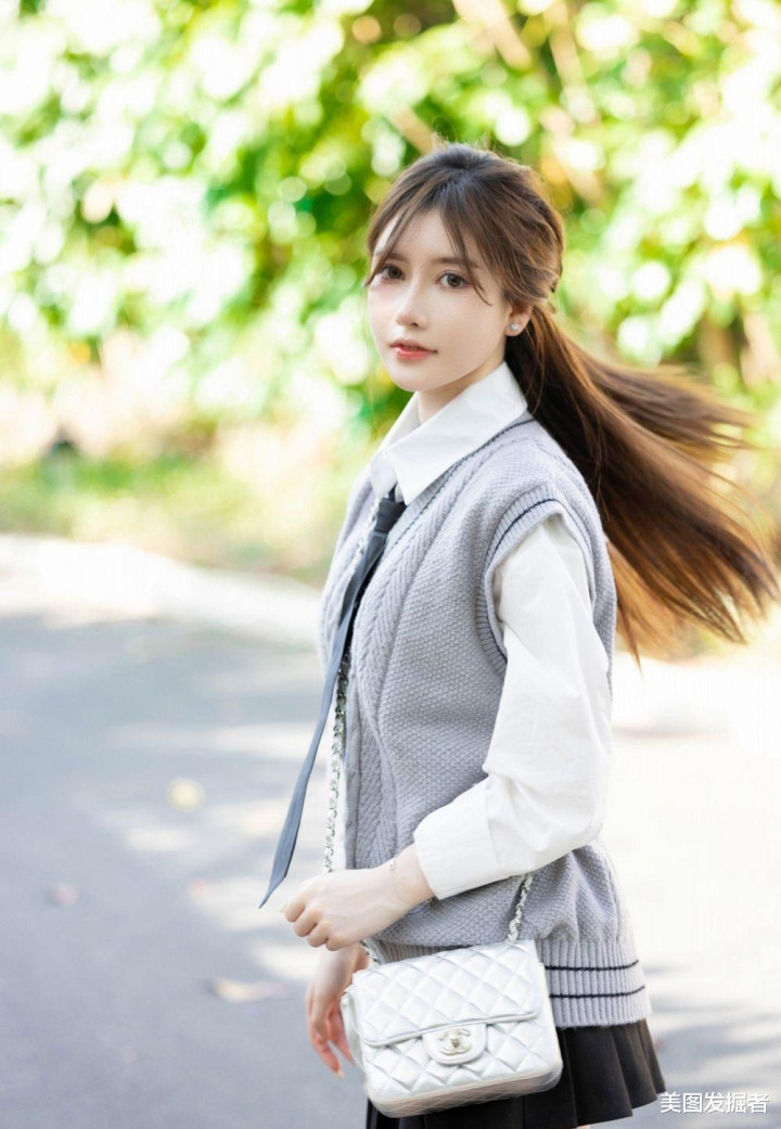 林荫道上,少女回眸浅笑。灰色麻花马甲叠穿白衬衫,黑色百褶裙勾勒S曲线,抬手扶发间,盈盈腰身与笔直美腿在光影中摇曳,银包与棕鞋点缀温柔,清甜文艺感扑面而来。