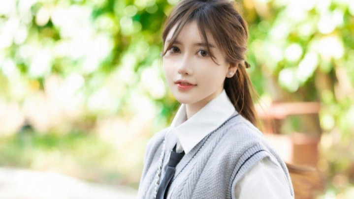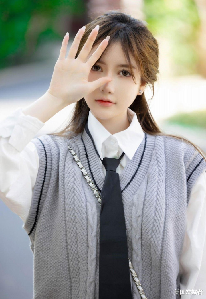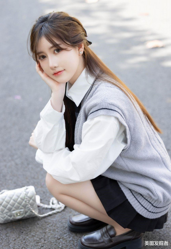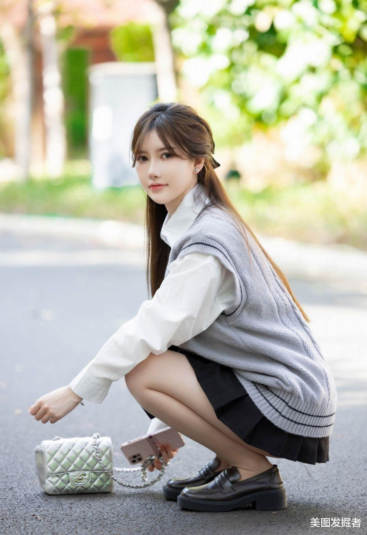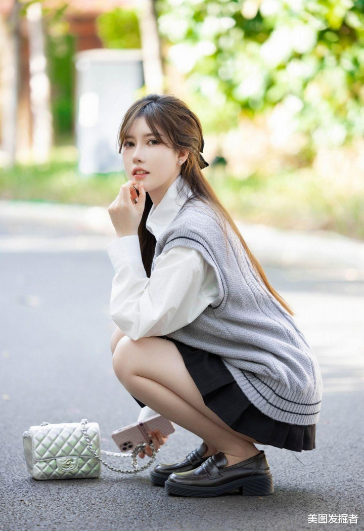 林荫道上,少女回眸浅笑。灰色麻花马甲叠穿白衬衫,黑色百褶裙勾勒S曲线,抬手扶发间,盈盈腰身与笔直美腿在光影中摇曳,银包与棕鞋点缀温柔,清甜文艺感扑面而来。